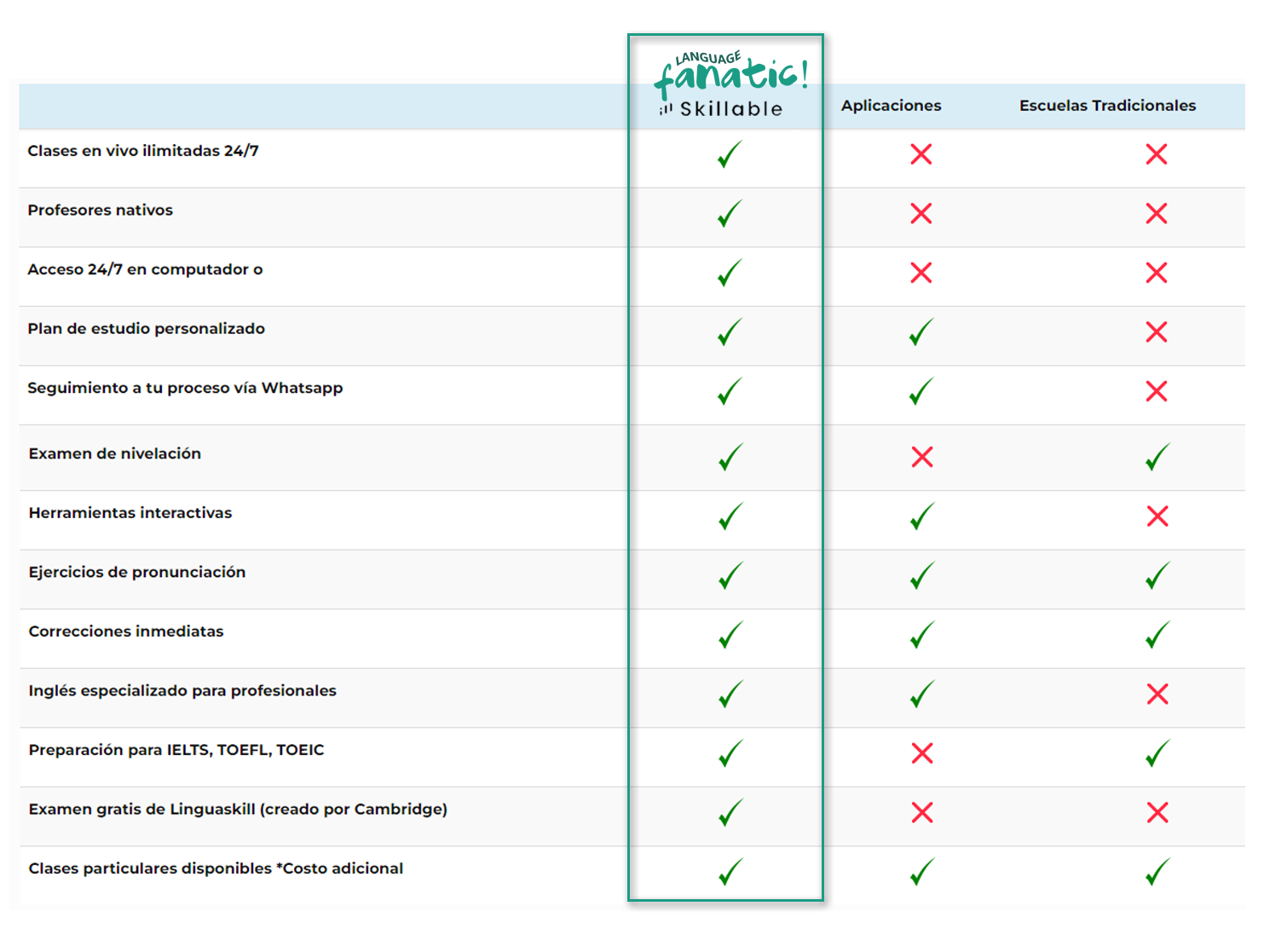 ¡Estudiar así está de moda! Junto a Skillable te brindamos las mejores herramientas digitales para que estudies como, cuando y donde quieras. ¡Es super Cool! Ver planes ¡Elegí tu plan ideal! BASIC Fans $18.000 x mes El ideal para un rápido progreso Plataforma con clases grupales ILIMITADAS de conversación y vocabulario 24/7 Contactanos SILVER Fans $35.000 x mes Con una clase individual para atender consultas junto a uno de nuestros profesores Plataforma + 1 clase INDIVIDUAL semanal Contactanos GOLD Fans $50.000 x mes Coordiná un programa integral de estudio con tu profesor Plataforma + 2 clases INDIVIDUALES semanales Contactanos PLATINIUM Fans $70.000 x mes Sacá el máximo provecho a tu profesor particular Plataforma + 3 clases INDIVIDUALES semanales Contactanos MASTER Fans $100.000 x mes Trabaja de forma personalizada con tu docente con una clase diaria Plataforma + 5 clases INDIVIDUALES semanales Contactanos ¡TU OPORTUNIDAD ES AHORA! Pre-Inscribite GRATIS 0800-362-5444 INSCRIBITE GRATIS Completá el siguiente formulario y reservá tu lugar, sin compromiso y de manera GRATUITA. Por favor, activa JavaScript en tu navegador para completar este formulario.Nombre y ApellidoTeléfonoE-mail Nombre Ciudad y CiudadEnviar Click en imagen para hacer zoom COMENZÁ AHORA